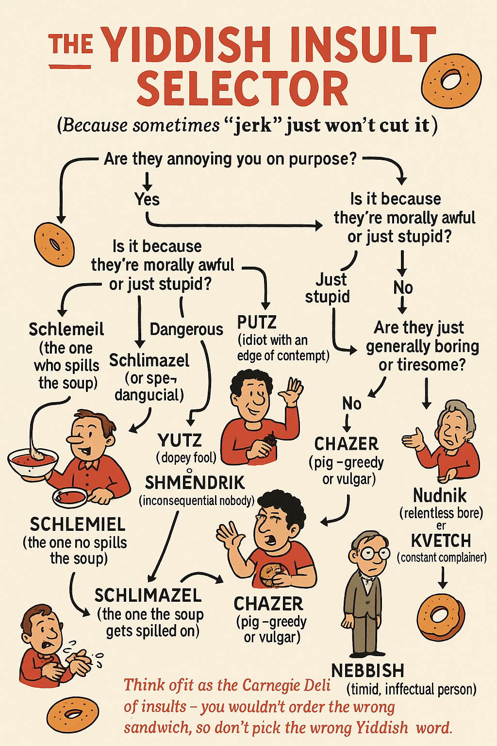 The influence goes deeper than vocabulary. The rhythms of Jewish-American comedy, from the Catskills to Seinfeld, echo the cadences of Yiddish storytelling. The way Jewish-Americans ask questions by making statements ("You're going out in this weather?"), the tendency to answer questions with questions ("Why do you want to know?"), the art of the perfectly timed pause — all of these trace back to Yiddish speech patterns.