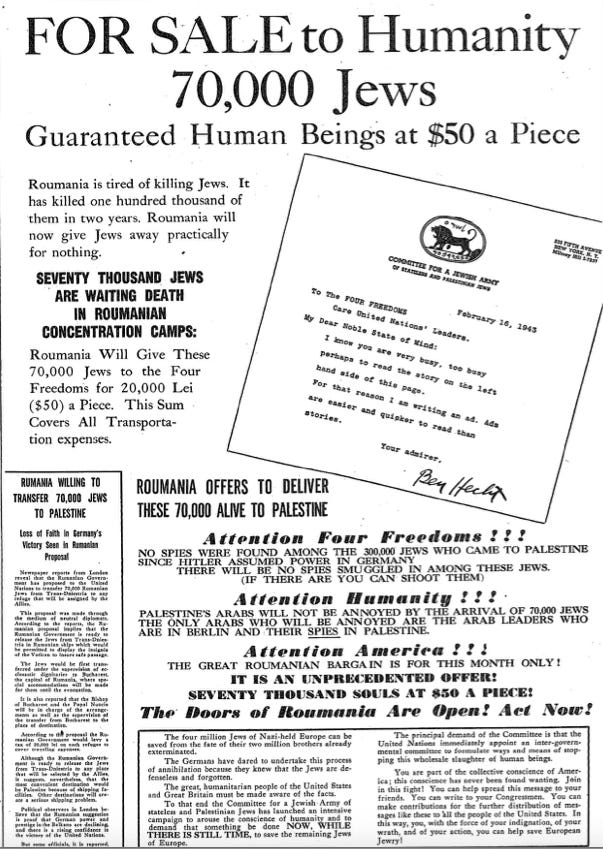 It also signaled his growing troubles in Hollywood. His friends repeatedly told him to stay away from politics, because his involvement could jeopardize his screenwriting career. Hecht didn’t listen, and he got involved with a group of Palestinian Jews, the Emergency Committee to save the Jewish People of Europe, becoming their in-house propagandist. His newspaper ads, the first to use the medium for political purposes, outraged many, including President Roosevelt.