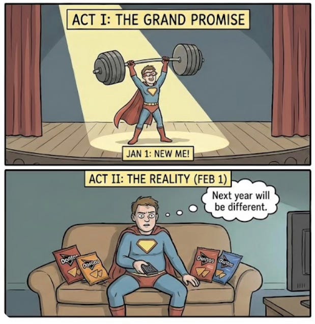 I’ve been around long enough to know that New Year’s resolutions are the participatory theater of self-improvement. Every January 1st, millions of people perform the ritual of promising to transform themselves, and by February most of them are back to eating Doritos on the couch, having convinced themselves that “next year will be different.”