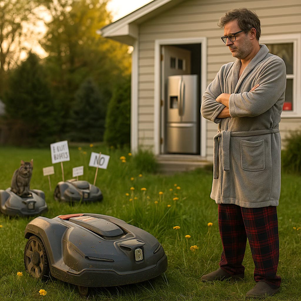 At 7:43 AM, Tom Brennan stood on his driveway in boxer shorts and a bathrobe last washed during the Obama administration. His RoboMow 3000 blinked menacingly from its charger.