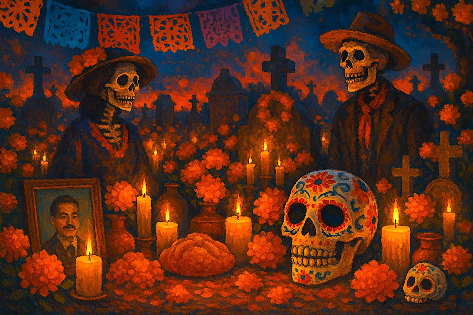 In Mexico, death is part of life’s continuous cycle. During Día de los Muertos, families welcome deceased loved ones with altars of food and photos, visit cemeteries, and share joyful memories. Skeletons become playful reminders that death is universal and natural. This openness creates emotional balance: to remember is to keep love alive, and to live fully requires embracing mortality.